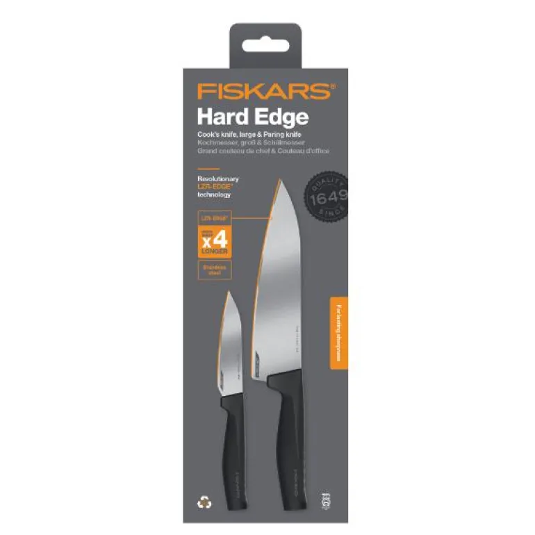 Hard Edge Kokkekniv er en robust og stødig følgesvenn på kjøkkenet. Den tåler store påkjenninger, og er perfekt til kjøkkenets mange kutteoppgaver. Hard Edge grønnsakskniv er en smart liten kniv som er perfekt til å hakke, dele og skive både frukt og grønnsaker. Knivens blad er i tykt rustfritt stål, med den revolusjonerende LZR-EDGE teknologien som gjør at kniven holder skarpheten 4 ganger lengre enn vanlige kniver. Knivens håndtak er i et patentert ergonomisk 3-D design, for å sikre det perfekte grepet under alle forhold.
