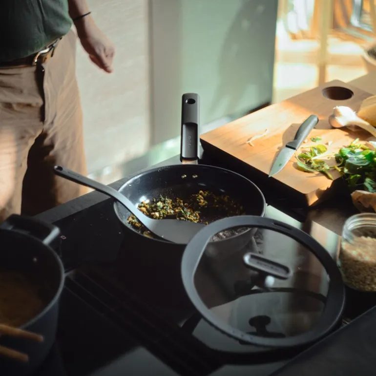 Energibunnen sparer tid og energi, med opptil 50 % raskere oppvarming på keramiske topper. Det varmebestandige glasslokket har smarte tømmefunksjoner for enkel håndtering. Pannen tåler temperaturer opp til 270 °C, og kan brukes i ovnen opptil 150 °C. Produsert i Finland, er dette en panne som kombinerer bærekraft, funksjonalitet og holdbarhet i én løsning.