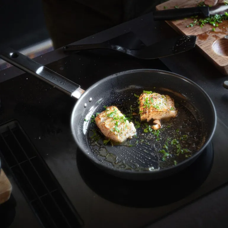 Laget av 100 % resirkulert aluminium, sørger pannene for rask og jevn varmefordeling på alle koketopper, inkludert induksjon. Fiskars’ robuste energibunn er spesielt effektiv på keramiske koketopper, hvor den reduserer oppvarmingstiden med opptil 50 % og energibruken med 30 %. Pannene tåler temperaturer opptil 150 °C i ovn, og kan brukes til steking opp til 270 °C, noe som gir stor fleksibilitet.