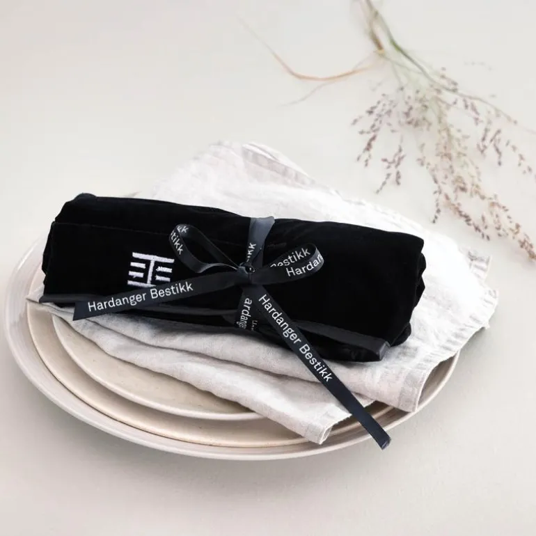 Bestikkpose Bestikkdeler i Hardangerserien fra Hardanger Bestikk. Smart, praktisk og fin bestikkpose med 12 lommer som gjør at bestikkdelene holder seg fine. Bestikkposen er laget av et mykt syntetisk materiale som ligner på velourstoff og rulles praktisk sammen med et stoffbånd før lukking. Bestikkposen er en smart, praktisk og ikke minst skånsom oppbevaringløsning til bestikkserier, tilleggsdeler og kjøkkenredskaper. Alle bestikkdeler bør være helt tørre før de legges i posen.