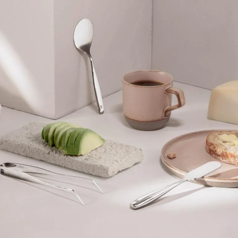 Buffè-settet fra Hardanger Bestikk er et chict og retroaktig anretningsbestikk. Bruk det til matservering rundt frokostbordet, i en smakfull buffet, under matlaging eller i krukker og skåler på kjøkkenet. Settet inneholder en påleggsspade, en smørkniv, en syltetøyskje og to påleggsklyper.