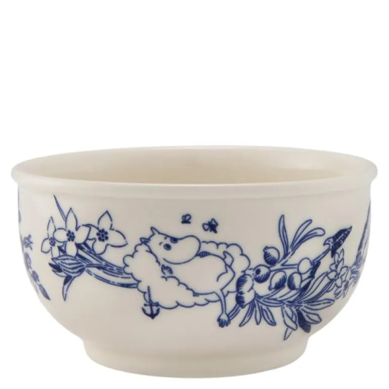 Skål 12 cm i hvitt og blått, med motiv av Mummi fra Haru-kolleksjonen til Moomin Arabia. Den harmoniske blå og hvite kolleksjonen er en hyllest til Tove Janssons liv og virke. Designet er inspirert av de myke, taktile formene på den steinete øya Klovharun, hvor Tove bodde om sommeren. Illustrasjonene er inspirert av kranser, som forfatteren selv skapte, og er en hyllest til plantelivet på øya.