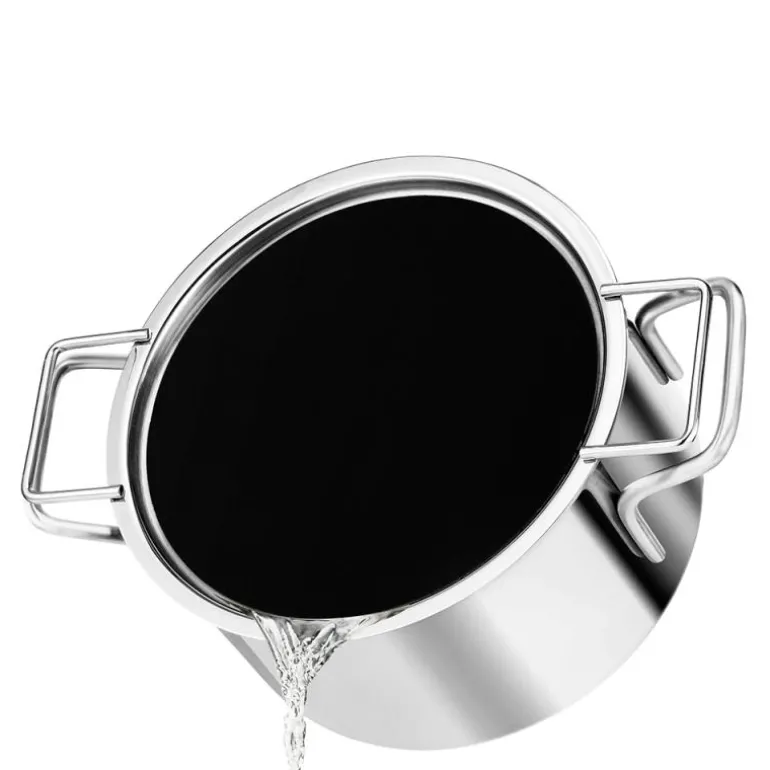 Hellelokket i rustfritt stål har integrert sil som er dekket av en silikontopp. Når du heller, slipper silikonet automatisk lokket slik at vannet kan renne ut gjennom silen.