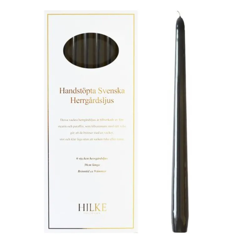 Hilke Collections svenske håndstøpte herregårdslys 30 cm høye i svart, er laget i fineste kvalitet og har en fantastisk glans. Lysene er kun overflatedyppet i farge og ikke gjennomfarget, det er det beste for både miljøet og lysets brennende egenskaper og gir rike vakre farger. Lysene er laget av stearin og parafin. Stearin sammen med den rette veken får lyset til å brenne med en vakker, stor og klar flamme uten verken å røyke eller renne. Lysene kommer i en vakker gaveeske og er perfekte som en gave, og er et perfekt supplement lysestakene.