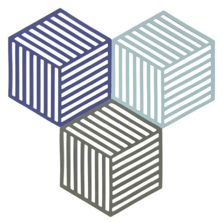 Hexagon bordskåner 3 stk 16 cm indigo/fog/olive taupe, fra Zone. Hexagon bordskånere i silikon er så grafisk dekorative at man blir fristet til å legge ut mange av dem i hele bordets lengde – uten å sette noe på dem. De tåler opptil 250 °C, og de kan vaskes i oppvaskmaskin. 16 x 14 x 0,9 cm.
