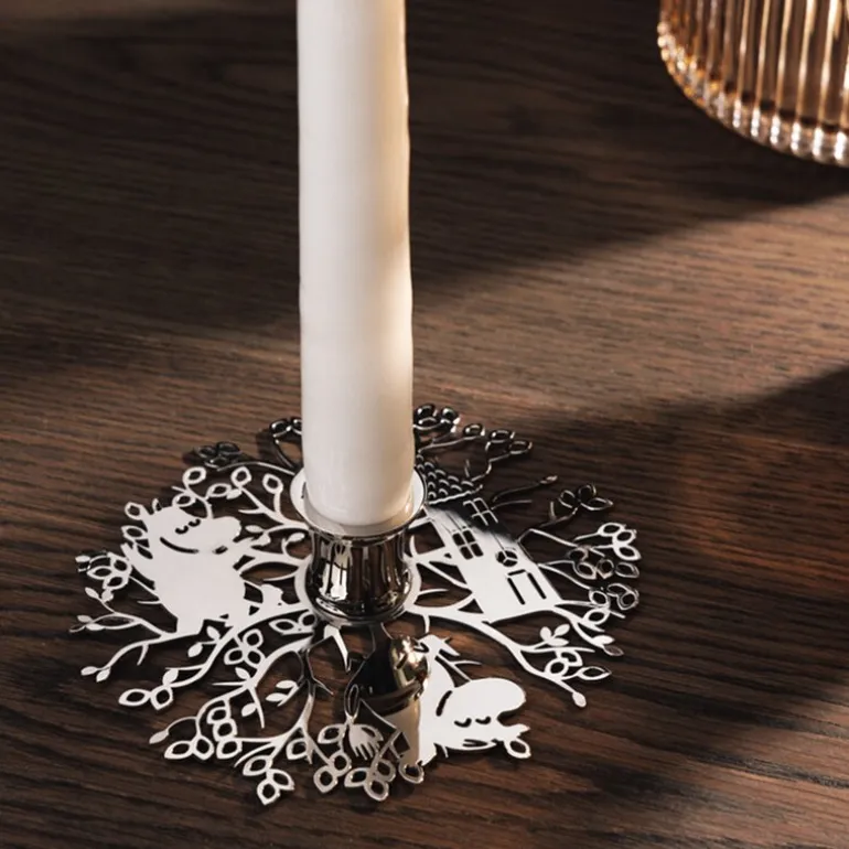 Opplev det eksklusive samarbeidet mellom Hilke Collection og Moomin med Hilke x Mummi No.1 lysestake 13,2×3,3 cm nikkelbelagt messing. En lysestake inspirert av den første Moomin-boken, ‘Småtrollene og den store oversvømmelsen,’ der Moomin-karakterer gjemmer seg i tregrenene, skjermet for stormen, mens de venter på at hele familien skal samles i Mummihuset.