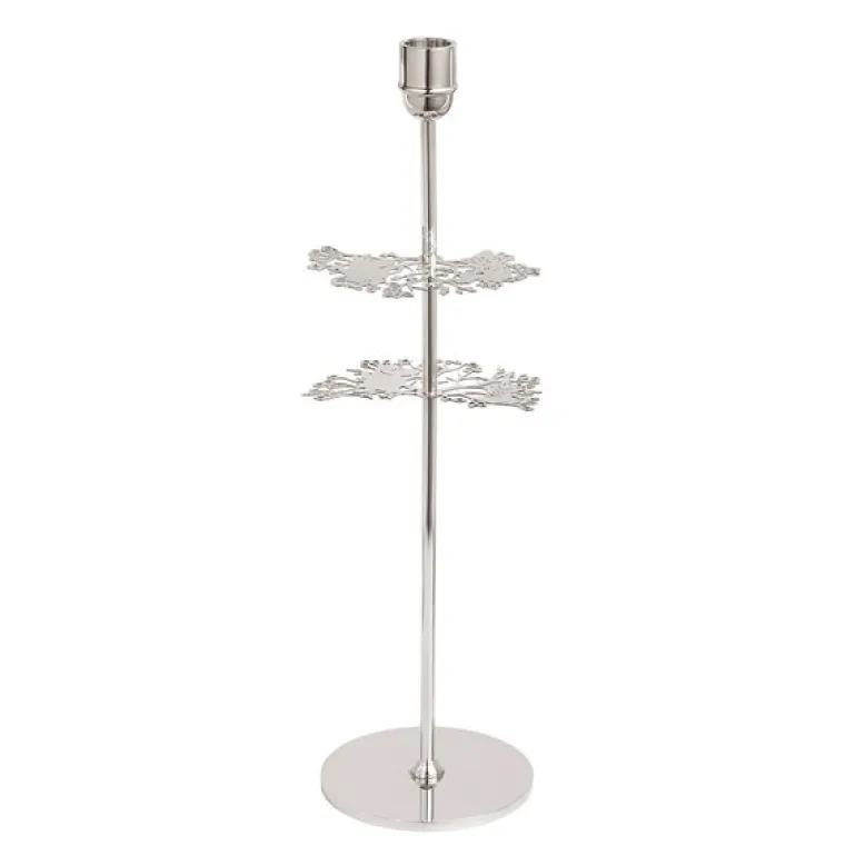 Hilke x Mummi No.2 lysestake på 40 cm i nikkelbelagt messing, er en hyllest til samarbeidet mellom Hilke Collection og Mummi, inspirert av den ikoniske fortellingen i den første Mummiboken, ‘Småtrollene og den store oversvømmelsen.’ Denne lysestaken er mer enn bare et dekorativt element; den fanger den emosjonelle dybden og symbolikken i historien, der Mummifamilien er adskilt og søker etter hverandre. Fra forsiden ser du hvordan tregrenene ikke møtes, et symbol på den splittede familien, mens sett ovenfra danner de en perfekt sirkel som representerer gjenforeningen og den sterke familiebåndet.