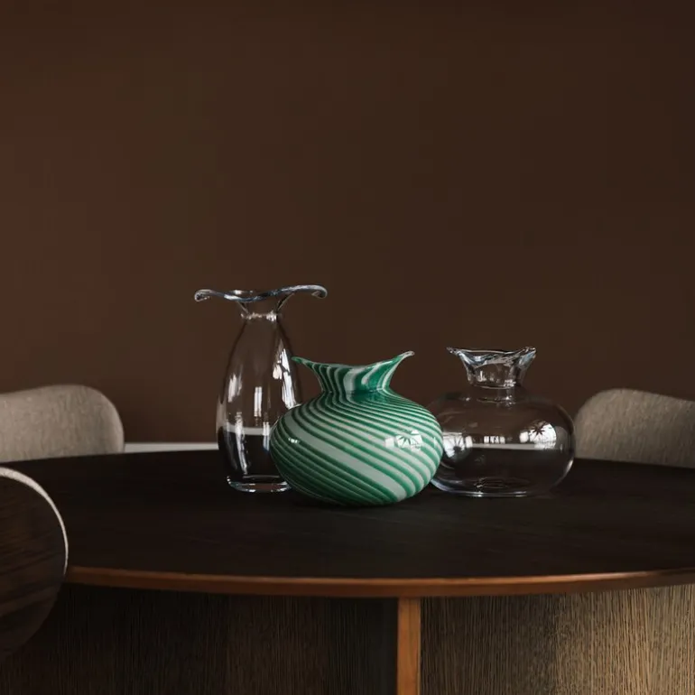 Munnblåst og håndlaget i Sverige i samarbeid med Skrufs Glasbruk, representerer vasen en kombinasjon av moderne design og tradisjonelt håndverk. Den klare glassoverflaten gir en følelse av letthet og gjør at lys kan spille fritt gjennom formen, noe som forsterker dens tidløse uttrykk.