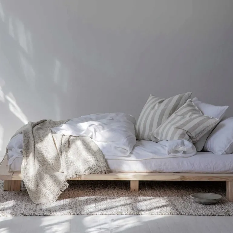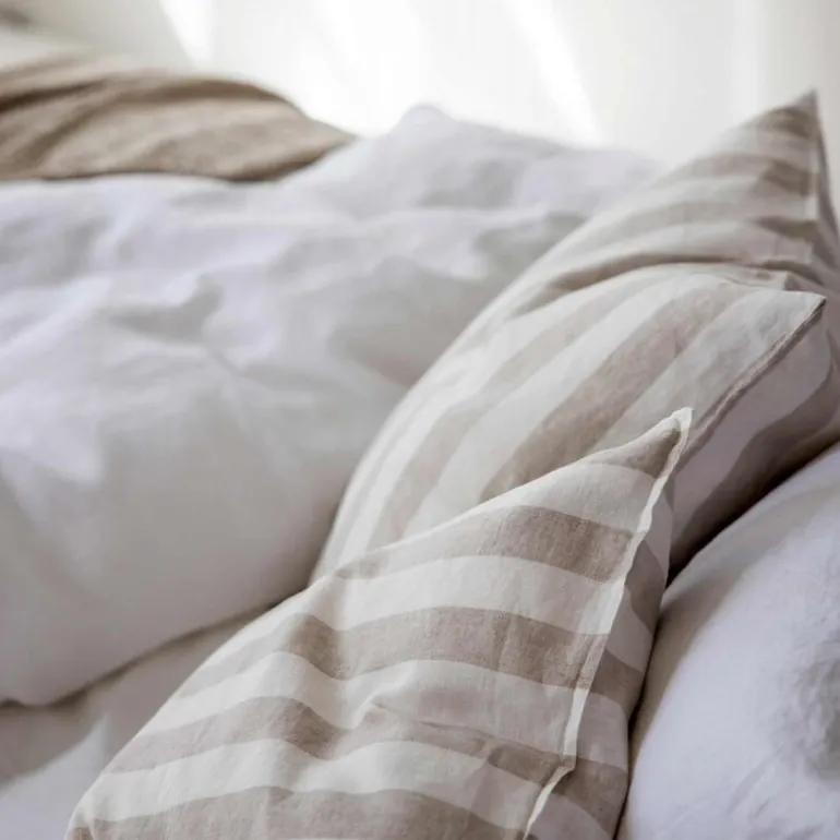 Holte putetrekk 50×50 cm i fargen sand fra Tell Me More er laget av myk, steinvasket lin, og har et klassisk design med brede striper i off-white og sandfarger. En fin, dekorativ kantsøm gir puten et ekstra stilfullt preg, mens den praktiske omslagslukkingen på baksiden gjør det enkelt å bytte innerpute.