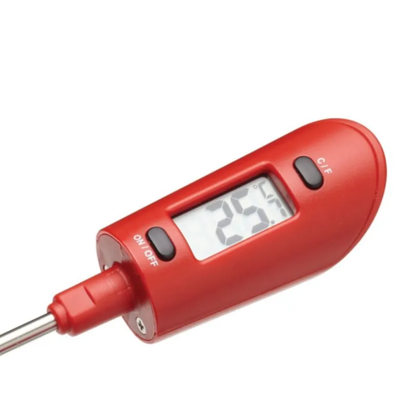 Med KitchenCraft Home Made termometerskje kan du enkelt oppnå presis temperaturkontroll under matlagingen. Denne innovative kombinasjonen av skje og digitalt termometer gjør det mulig å måle temperaturen mens du rører, noe som eliminerer behovet for separate termometere for syltetøy og sukker. Utstyrt med en avtakbar sonde, måler skjeen temperaturer fra 20 °C til 220 °C, som vises på en lettlest LCD-skjerm. Dette gir deg full oversikt over temperaturen med et enkelt blikk.
