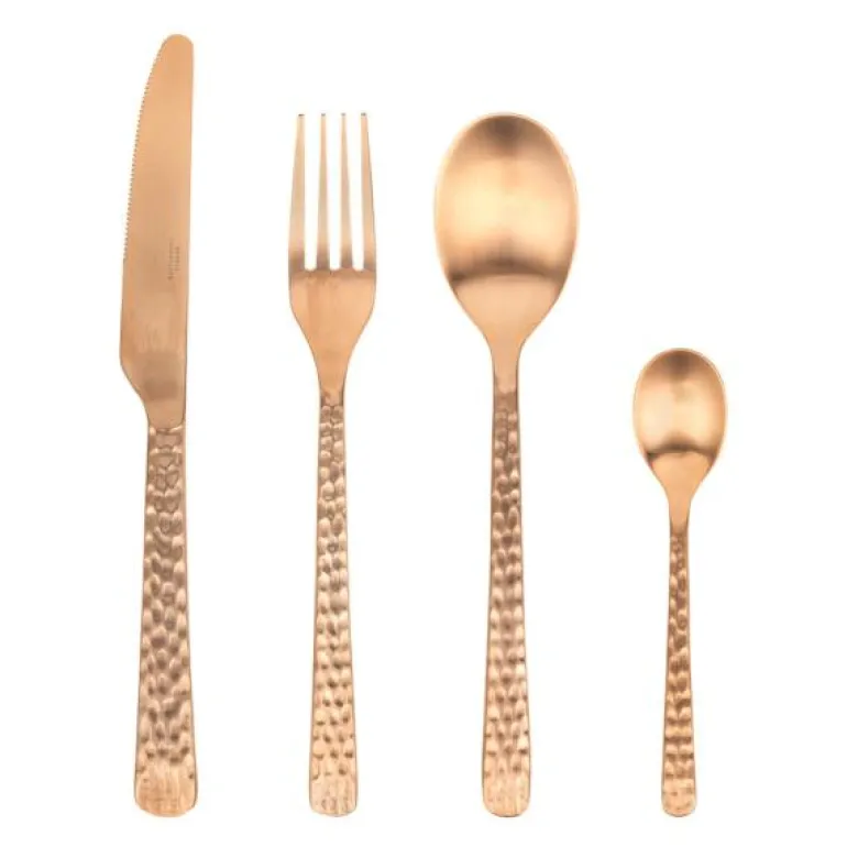 Bestikksett, Hune 16 deler hamret kobber, fra Broste Copenhagen. Bestikksettet er utført i kobberfarget rustfritt stål, og gir et stilig utseende til spisebordet. Settet kommer i en lekker gaveeske, og består av 4 kniver, 4 gafler, 4 skjeer og 4 teskjeer. Tåler oppvaskmaskin opp til 65 grader.