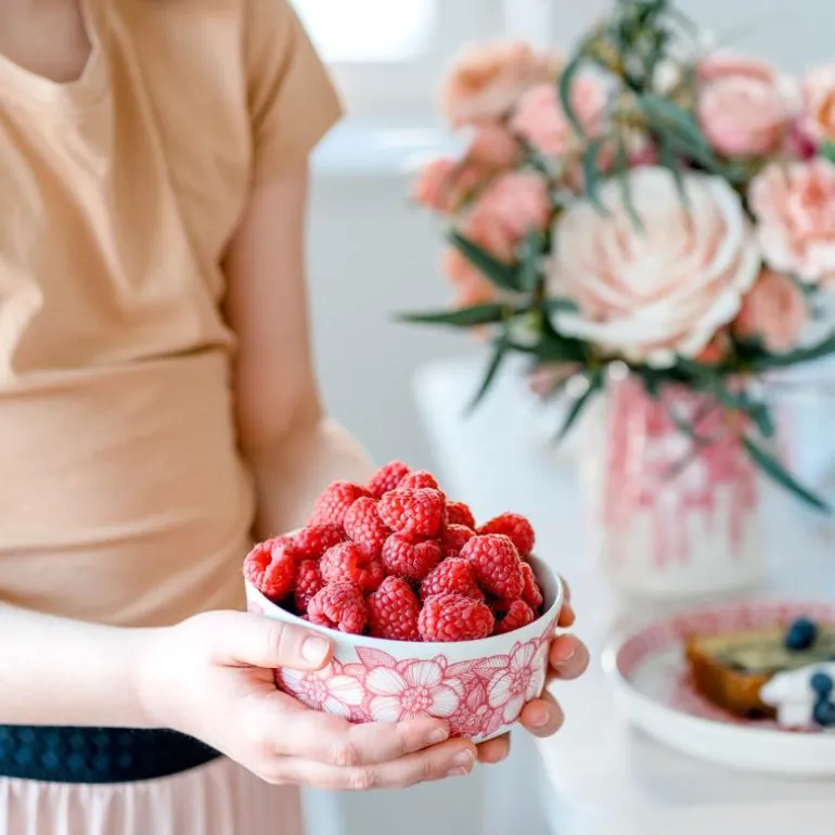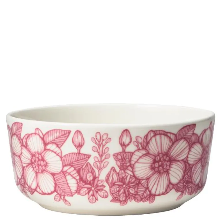 Huvila bowl 13cm. Designer Heini Riitahuhta ble inspirert av den varme følelsen i bestemorens hjem og den gode stemningen. Mønsteret er basert på en villrose med et snev av det gamle Finland og velkjente Arabia. De moderne formene sammen med et delikat mønster gjør at serviset skiller seg ut i borddekkingen. Designer Heini Riitahuhta. Kan vaskes i oppvaskmaskin.
