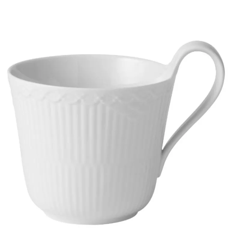 White Fluted Half Lace Kopp med høy hank på 33 cl fra Royal Copenhagen er en tidløs del av White Fluted-serien, kjent for sitt delikate blondemønster og klassiske design. Med sin rene hvite farge og minimalistiske stil, er koppen både elegant og funksjonell, noe som gjør den perfekt til både hverdagsbruk og spesielle anledninger.