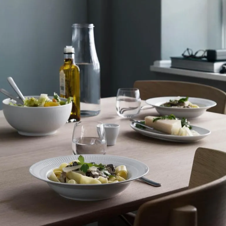 Hvit Riflet forteller historien om kongelig porselen og håndverk i en minimalistisk og moderne stil. Resultatet? En moderne klassiker. Dens rene hvithet og enkle design gjør den ideell å kombinere med andre riflede design. For de som liker å nyte livet uten at det går på bekostning av kvalitet, er Hvit Riflet et ideelt hverdagsservise for det moderne hjem. Elegant og enkelt. Grunndesignet er identisk med servisene Musselmalt Riflet, Blå Mega Riflet og Hvit Signatur. Det passer godt sammen med disse – men er også moderne og elegant på egen hånd!