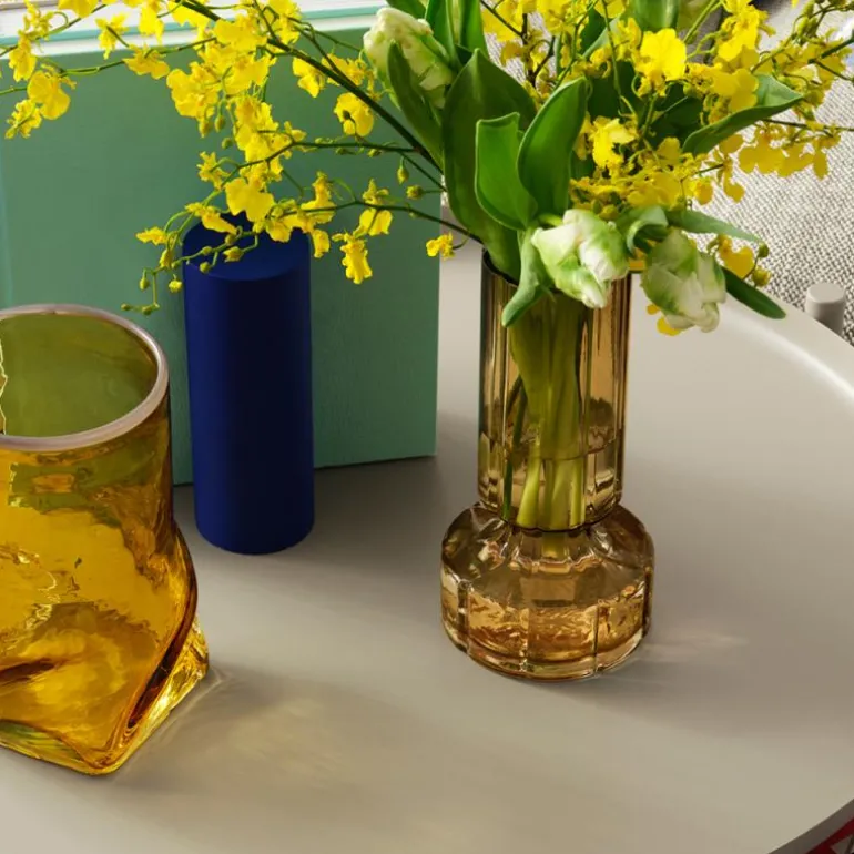 En klassisk tidløs vase, som passer perfekt til hyasinter/ svibler, men som ut over til friske blomster, også er flott med strå, tørrkede blomster, grangrener el.lign. Vasen finnes både i klart glass, den gylde Indian tan farge og den gråtonede Smoke farge. De 4 forskjellige formene er fine både alene og mikset sammen – både på det veldekkede bord, på et tablau og en hylle. Alle vasene er munnblåste.