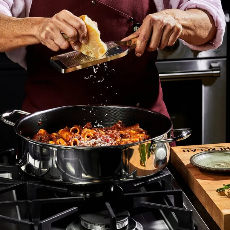 Pannen er utstyrt med to solide håndtak som gir deg et godt grep, noe som gjør det enkelt å håndtere pannen selv når den er full. Takket være Hexclads revolusjonerende hybridkonstruksjon, kan du nyte holdbarheten og varmeresistensen til rustfritt stål, samtidig som du drar nytte av nonstick-beleggets brukervennlighet, noe som gjør rengjøringen til en lek.