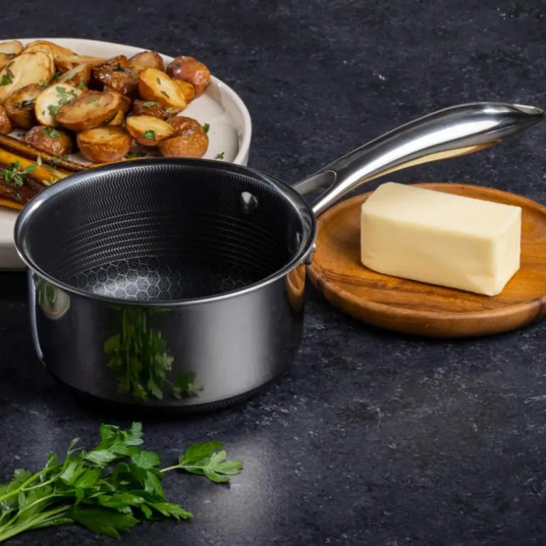 Med Hexclad kan du tilberede alt fra den mest delikate fisken til en saftig og perfekt brunet biff uten å bekymre deg for hvilken stekepanne eller gryte du skal benytte. Siden du har fordelen av en vanlig non-stick stekepanne og en stålpanne, trenger du kun bruke et minimum av stekefett samtidig som du kan bruke metallredskaper rett i pannen eller gryten.