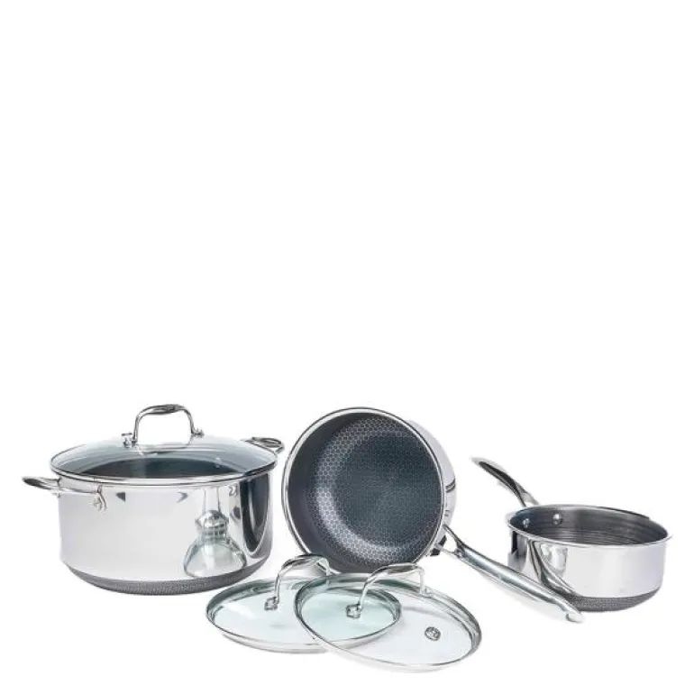 Hybrid grytesett 6 deler er et komplett sett med 3 gryter og 3 lokk fra Hexclad. Hexclad tilbyr non-stick-funksjon både på innsiden og utsiden. Som den originale hybridpannen på markedet var Hexclad pioneren med denne teknologiske innovasjonen.