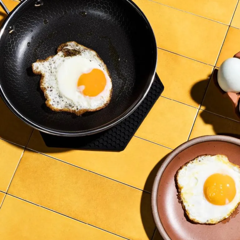 Alle Hexclad-produkter er bygget opp med tre lag av magnetisk stål i bunnen, noe som sikrer en svært effektiv varmefordeling. Dette gjør at du kan bruke lavere temperaturer for å oppnå perfekte resultater. Det stålkledde håndtaket har en ergonomisk utforming og holder seg kjølig under bruk på kokeplater. Pannens solide konstruksjon med metallhåndtak gjør det også enkelt å sette den rett i stekeovnen.