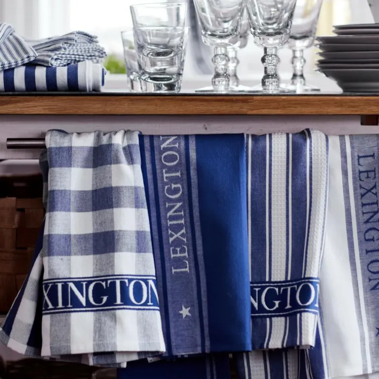 Icons star kjøkkenhåndkle hvit/blå fra Lexington. Dette OEKO-TEX®-sertifiserte kjøkkenhåndkleet er i ren bomull og har et stilrent design med jacquardstriper. Det absorberende kjøkkenhåndkleet har merkenavnet på midten, brettet fald og hempe med logo.