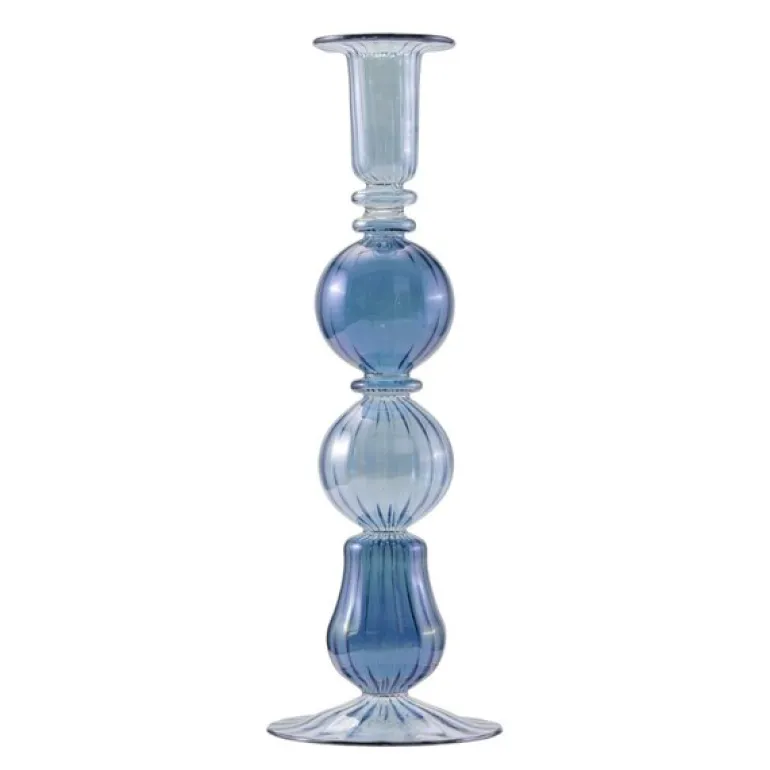 Illume lysestake 25 cm lyseblå/blå fra Moonlight Copenhagen er et fargerikt og livlig innslag som gir ethvert rom en umiddelbar følelse av glede og energi. Den vakre kombinasjonen av lyseblått og blått i munnblåst glass skaper en unik lysestake som fanger blikket og sprer en varm og innbydende atmosfære. Den delikate strukturen på glasset gjør at hvert eksemplar er helt unikt, noe som understreker den håndlagde kvaliteten som kjennetegner Moonlight Copenhagen. Illume lysestake er designet for kronelys og passer perfekt på spisebordet, i stuen eller som en fargerik detalj på hyllen. Med sitt lekne uttrykk og utsøkte håndverk, gir denne lysestaken et løft til innredningen og setter et personlig preg på hjemmet ditt. Moonlight Copenhagen skaper interiør med kjærlighet og omtanke, og Illume lysestake er et strålende eksempel på deres engasjement for kvalitet og skjønnhet.