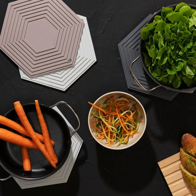 Sekskantet bordskåner som er produsert i silikon og som tåler varme gryter, panner og ildfaste former.Kan rengjøres i oppvaskmaskin.Mål:Lengde: 21,5 cmBredde; 18,5 cmHøyde: 0,6 cm