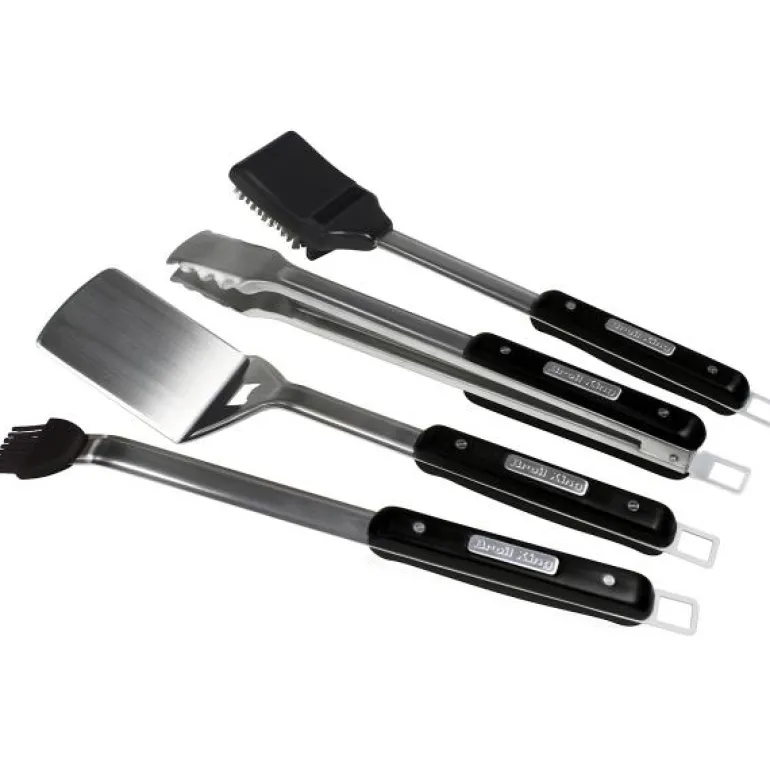 Grillredskapssett i rustfritt stål Imperial™.Redskapssettet av høy kvalitet fra Broil King® er laget av ett stykke 1,8 mm rustfritt stål, tøft nok for den mest kresne grillkokken. Kraftige håndtak i varmebestandig, herdet plast med Broil King®-logo i rustfritt stål gir den ideelle kombinasjonen mellom design, funksjonalitet og holdbarhet. Settet inneholder en spade, låsbar tang, silikonpensel og grillbørste. L:48 cm.