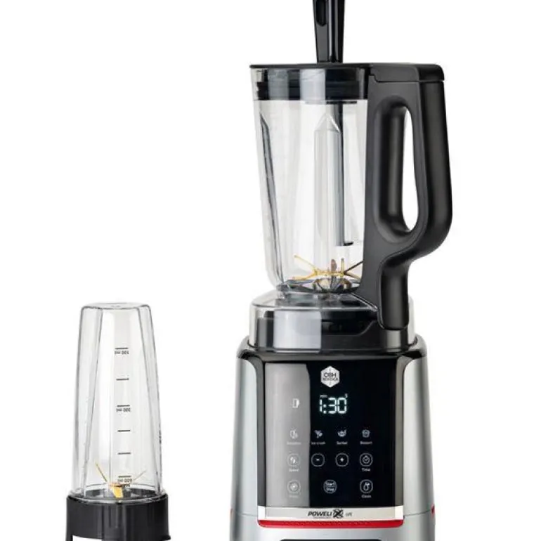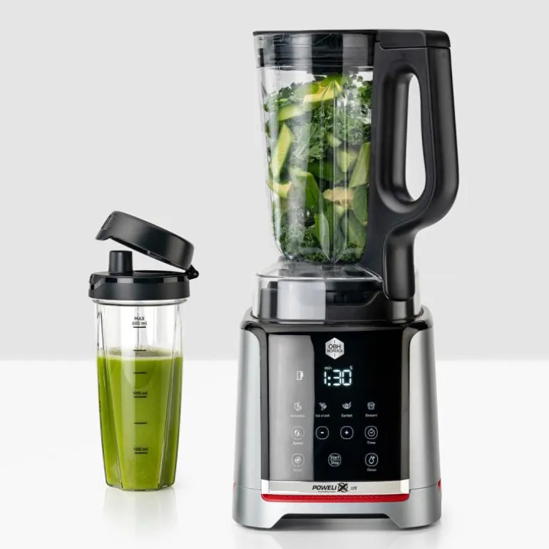 Infiny Mix+ blender 1600W fra OBH Nordica. Ser du etter en kraftig og praktisk blender med take away-flaske? Infinymix+ er en høyhastighetsblender med kraftig 1600-watts motor og 6 skarpe, titanbelagte kniver som gir svært jevnt resultat. Med de skarpe og slitesterke Powelix-knivene får du en perfekt, kremet konsistens hver gang. Med Infinymix+ er det enkelt å lage smoothie og smakfulle desserter! Velg program på det digitale blenderdisplayet: smoothie, sorbet, knust is eller dessert. Det automatiske rengjøringsprogrammet gjør det enkelt å vaske blenderen. Kannen rommer 1,75 liter og take away-flasken 600 ml. Kos deg med deilige drikker både hjemme og på farten!