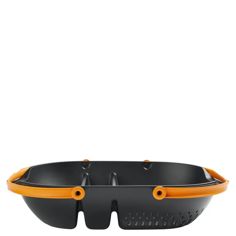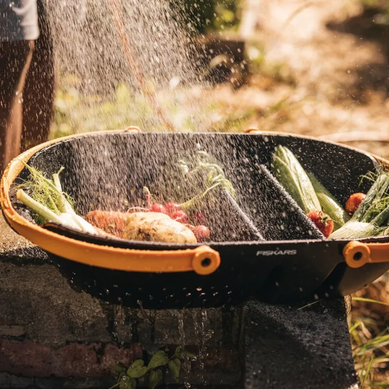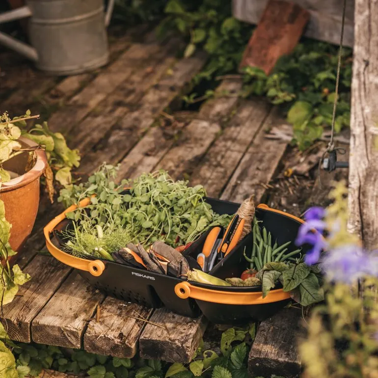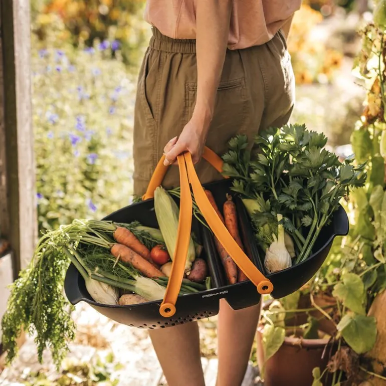 Innhøstingskurv 61×38,8×13,7 cm svart/oransje fra Fiskars. Praktisk høstekurv å samle hagens skatter i. Ergonomisk håndtak som kan låses sammen. Sidehåndtak for alternativt grep. Enkel å bære og rengjøre. perforert rom for skylling av avlingen. Til oppbevaring av høsteutstyr.