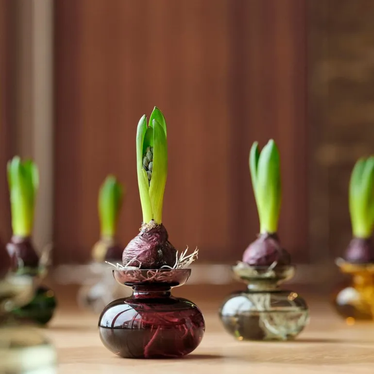 Denne vasen er ideell for å vise frem hyasinter og andre småplanter, og gir en enkel, men effektfull pynt til bordet i de kalde vintermånedene. Den kan også kombineres med flere vaser, omgitt av dekorative elementer som julekuler og kongler, for å skape et stemningsfullt stilleben i julehøytiden. Om våren kan du fylle vasen med små, friske blomster som snøklokker eller perlehyasinter for en delikat og naturlig dekorasjon.