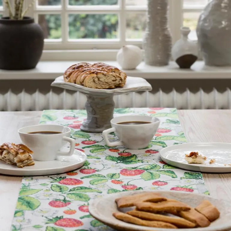 Jordbær løper fra Ekelund gir borddekkingen et friskt og sommerlig preg med sitt detaljerte jordbærmotiv. Med målene 35×120 cm passer den både på langs og på tvers av bordet, enten alene eller som et dekorativt lag over en duk. Det fargerike mønsteret skaper en livlig og innbydende atmosfære, perfekt til alt fra hverdagens måltider til festlige anledninger.