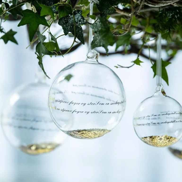 De eksklusive julekulene SE ILDEN LYSE er munnblåste og håndlagde med skinnende stjerner og stjernestøv. De kommer i to størrelser, i gull eller sølv, med sangtekst utenpå og stjernestøv inni, og med hvitt silkebånd klare til oppheng. SE ILDEN LYSE gjør julen og hjemmet ditt enda vakrere.