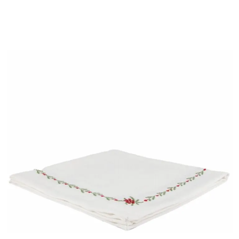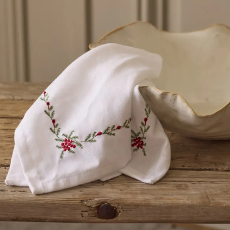 Den hvite bunnfargen med broderte detaljer i grønt og rødt gir servietten et tidløst uttrykk som passer perfekt til både hverdagsmåltider og høytidelige sammenkomster. Et nydelig innslag som tilfører borddekkingen et klassisk og raffinert preg.