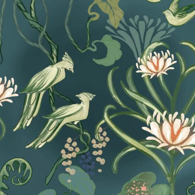 Inspirasjonen er hentet fra fantasiens jungel med elementer som fugler, blomster og trær. Anna og Finn er begge personer som alltid bobler over av ideer. Det er som å åpne et skattkammer fullt av elementer og dekorer. Dekoren JUNGEL har de laget som et frodig og spennende mønster av urørt jungel som vokser på høyder av apifytter, lianer, store alocasier omgitt av eksotiske fugler og kattedyr. Jungeldekoren har et balansert mønster og er egentlig en mønsterrapport. Våre servietter er et utsnitt av dette mønsteret for å passe perfekt som servietter til det dekkede bord. JUNGEL serviettenes farger er nøye tilpasset dagens trender og interiør i det nordiske markedet, og matcher selvfølgelig også Magnors lyskolleksjon.