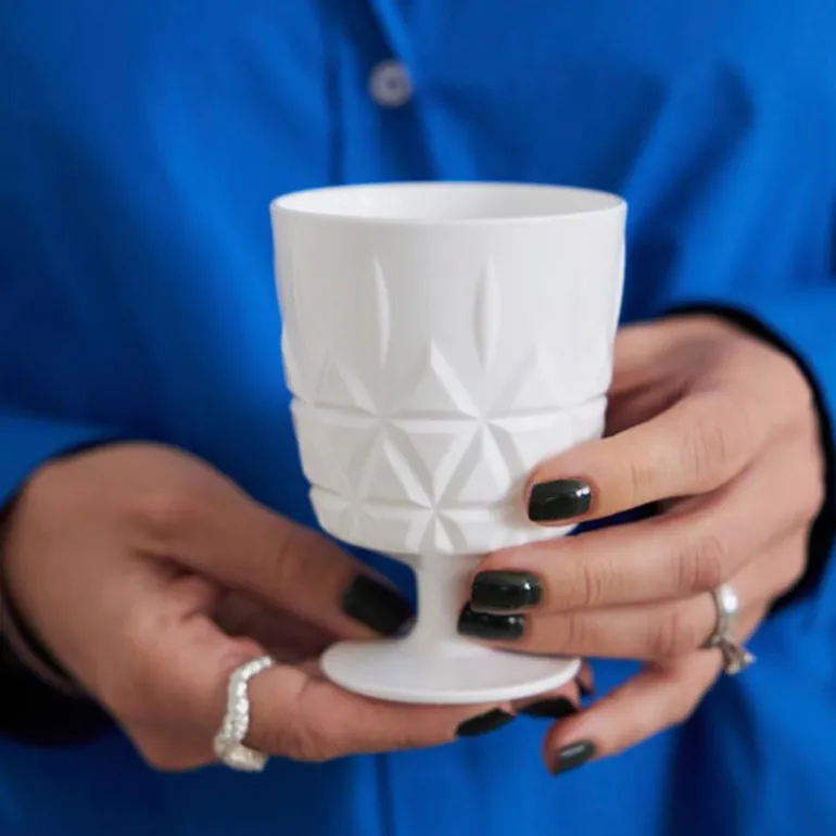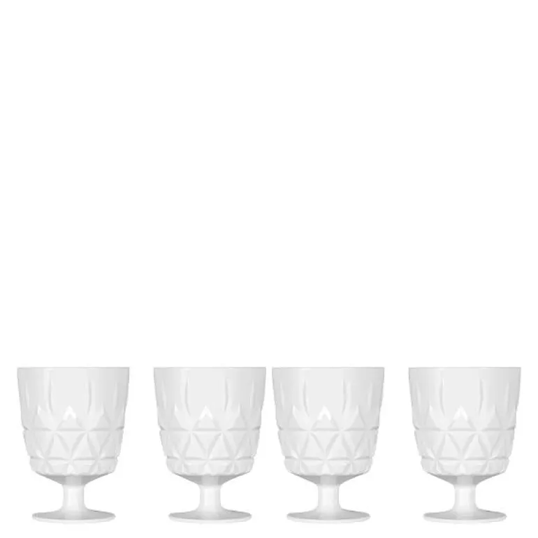 Fire piknik glass på stett, Juni 30 cl, fra Sagaform. Disse piknikglassene er laget av akrylplast og kan tas med ut på piknik, til sjøs, i skogen eller hvorfor ikke i vinterhagen. Piknikglassene på stett er tilgjengelige i en luksuriøs og skarp eggeskallhvit farge med et vakkert krystallmønster. Bruk dette glasset til juicen men også til drinken på en varm sommerkveld.