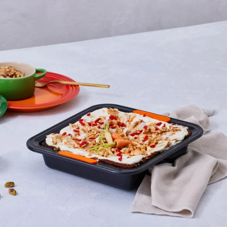 Denne kvadratiske kakeformen i karbonstål (20 cm) fra Le Creuset er perfekt for hjemmelagde kaker, brød og gratenger. Overflaten med non-stick-belegg gjør at maten slipper enkelt og rengjøringen går raskt. Den har varmebestandige silikonhåndtak på sidene, som gir godt grep og trygg håndtering – selv med ovnsvotter. Formens innside bør smøres lett før bruk for best resultat. Du kan steke opp til 240 °C, og formen tåler også å fryses.