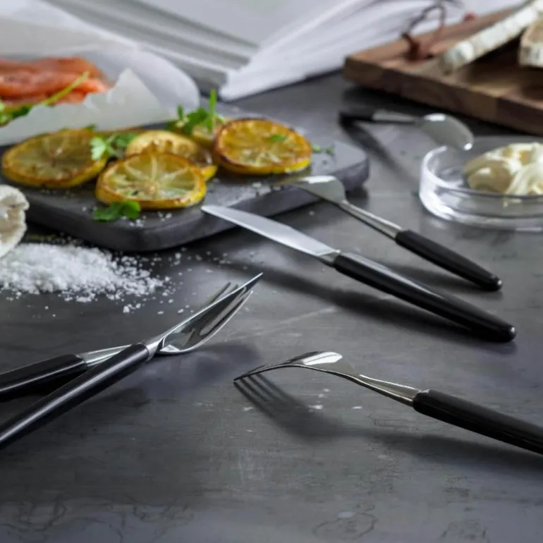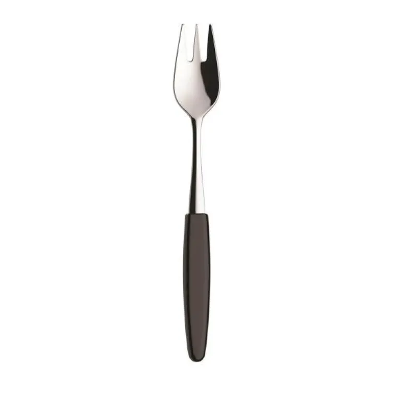 Kakegaffel svart. Skaugum bestikk med sort skaft er en klassiker! Skaugum Bestikks kronelogo er deres garanti for at du holder et håndlaget, norsk kvalitetsbestikk. Bordknivene er smidde, som gir en skarphet og kvalitet som ingen andre produksjonsmetoder klarer. I tillegg til kniv, skje og gaffel har vi et bredt utvalg av andre deler, som for eksempel kakespade, salatbestikk og ostehøvel. Bestikket er produsert i rustfritt stål med 18/8-kvalitet. Skaugum Bestikk i hvitt og sort kan vaskes i maskin. Vi anbefaler at du alltid skyller bestikket før du setter det i maskinen, bruk gjerne finvaskprogram. Skaugum sine bestikk har sett like ut helt siden starten i 1943. Skaugum lager sine bestikk for hånd, som er en spennende og tidkrevende prosess. Stålet varmes opp til 1035 grader før vi slår med en hydraulisk hammer ned i ønsket form. Våre plastskaft blir støpt mens treskaftene sages og freses. Vi skjefter, polerer, og borer hver del for hånd på maskiner fra en annen tidsalder.
