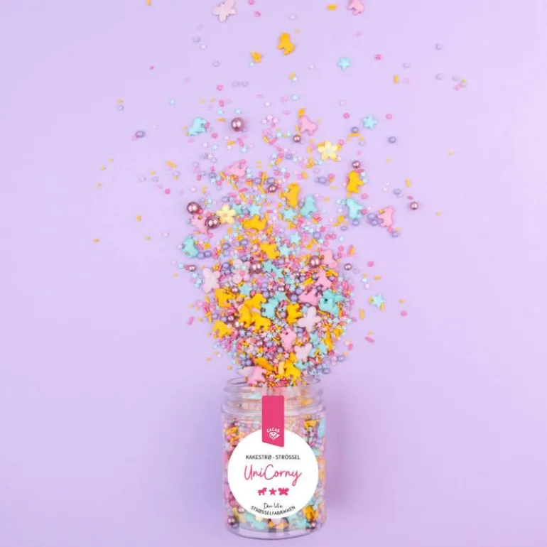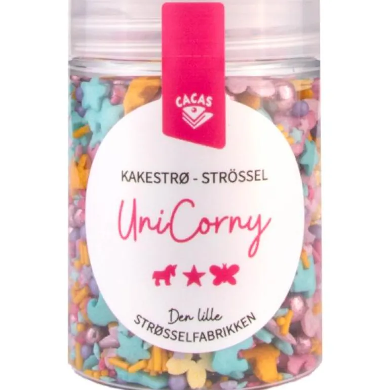 Dekosrativ kakestrøssel, enhjørning UniCorny, fra Cacas. Pynt opp dine bakverk med dette fargerike enhjørning kakestrøet fra Cacas. Miksen består av strø i magiske farger og inneholder enhjørninger, blomster, sommerfugler, crispy kuler, m.m. Bruk strøet som pynt på både cupcakes, kaker, cakepops og cookies. Skal du stelle i stand til enhjørningsfest er denne miksen perfekt.