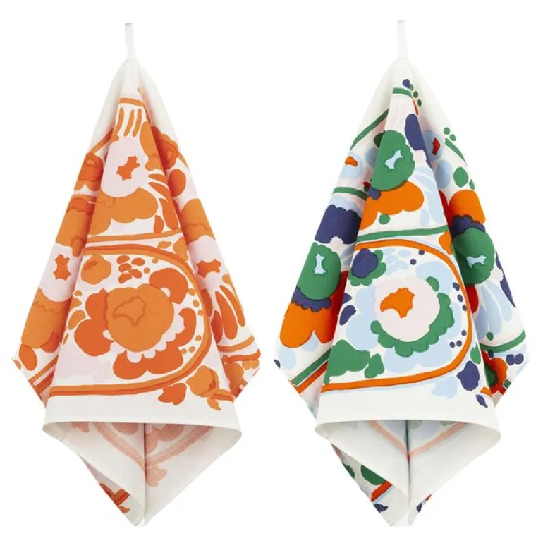 Håndklærne er trykt i Helsinki og har praktiske opphengsløkker langs den lange kanten for enkel oppbevaring. Perfekt for daglig bruk på kjøkkenet, eller som en dekorativ detalj som tilfører fargerik energi til rommet.