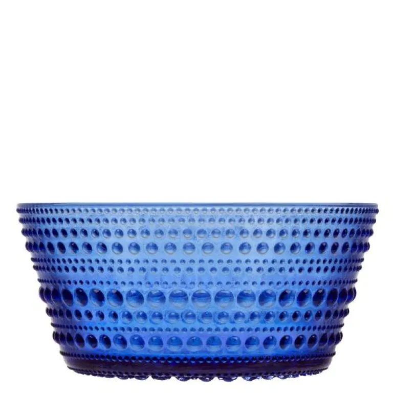 Kastehelmi skål 23 cl fra Ittala i ultramarinblå. Kastehelmi betyr duggdråpe på finsk, og du kan kjenne følelsen av morgenduggen i de uthevede dråpene i Oiva Toikkas ikoniske kolleksjon. Kastehelmi-skålen i ultramarinblått er perfekt for frokost, snacks, dipp og mer. Kastehelmis forskjellige farger er laget i Iittala glassfabrikk i Finland, og er vakre både alene og i kombinasjon med andre farger.
