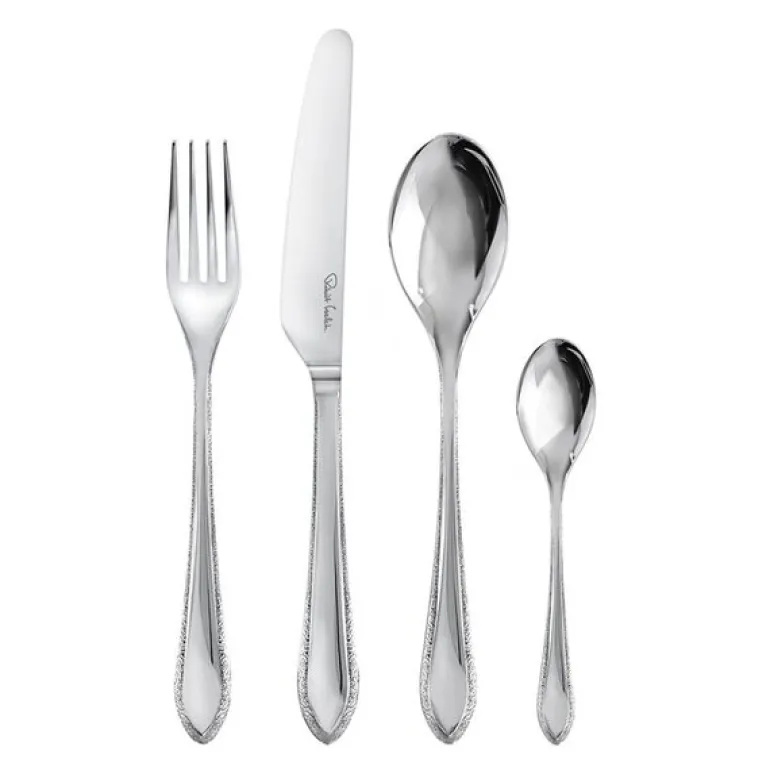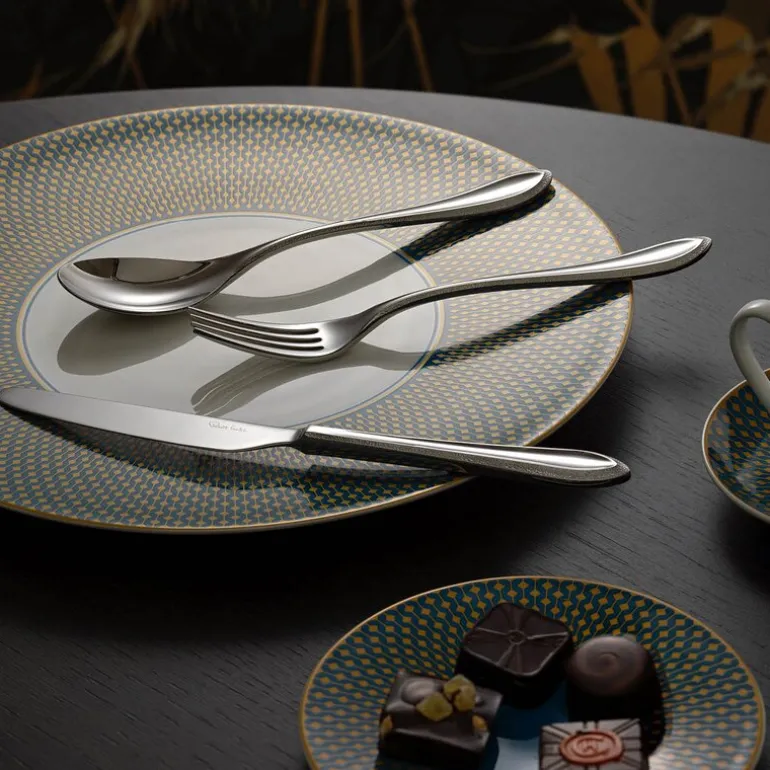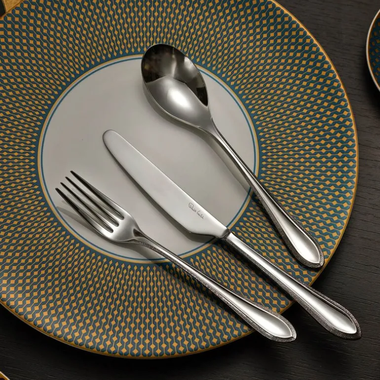 Robert Welch Kemble Texture 24‑delers bestikksett kombinerer en moderne, strukturert overflate med en tidløs form. Det har taktile håndtak som gir godt grep og et raffinert uttrykk.
