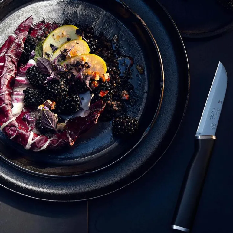 Kineo grønnsakskniv 9 cm (20 cm)Kineo-knivserien består av til sammen 9 forskjellige kniver – fra den vanlige all-rounderen til kokkekniven og den kinesiske kjøttøksen. Selv om de enkelte knivbladformene er veldig forskjellige, er egenskapene til det spesialherdede rustfrie stålet glimrende. Takket være den patenterte WMF Performance Cut-teknologien gir bladene enestående langvarig skarphet dag etter dag, kutt etter kutt. Det kinetisk ergonomiske designet med håndtak i rustfritt stål sikrer et behagelig grep og en balansert følelse når man kutter, hakker og skjærer. Kineo-knivserien: den perfekte kniven fra starten – med et enestående forhold mellom pris og prestasjon, fremstilt i Tyskland.