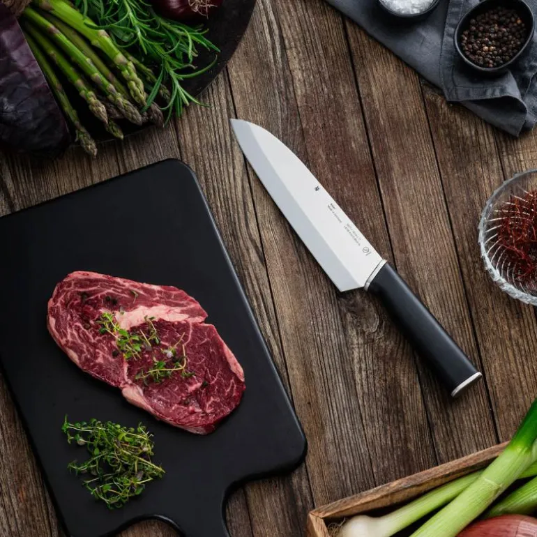 Kineo santoku-kniv 18 cm (31 cm)Kineo-knivserien består av til sammen 9 forskjellige kniver – fra den vanlige all-rounderen til kokkekniven og den kinesiske kjøttøksen. Selv om de enkelte knivbladformene er veldig forskjellige, er egenskapene til det spesialherdede rustfrie stålet glimrende. Takket være den patenterte WMF Performance Cut-teknologien gir bladene enestående langvarig skarphet dag etter dag, kutt etter kutt. Det kinetisk ergonomiske designet med håndtak i rustfritt stål sikrer et behagelig grep og en balansert følelse når man kutter, hakker og skjærer. Kineo-knivserien: den perfekte kniven fra starten – med et enestående forhold mellom pris og prestasjon, fremstilt i Tyskland.