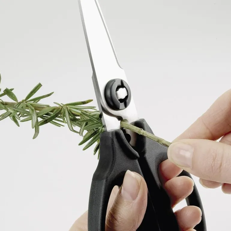 Saksen har et skarpt skjær i rustfritt stål og knivbladene kan demonteres for enkel og effektiv rengjøring i oppvaskmaskinen. Den har innebygd to huller med skarpe kanter til å skille urtebladene fra stilken.