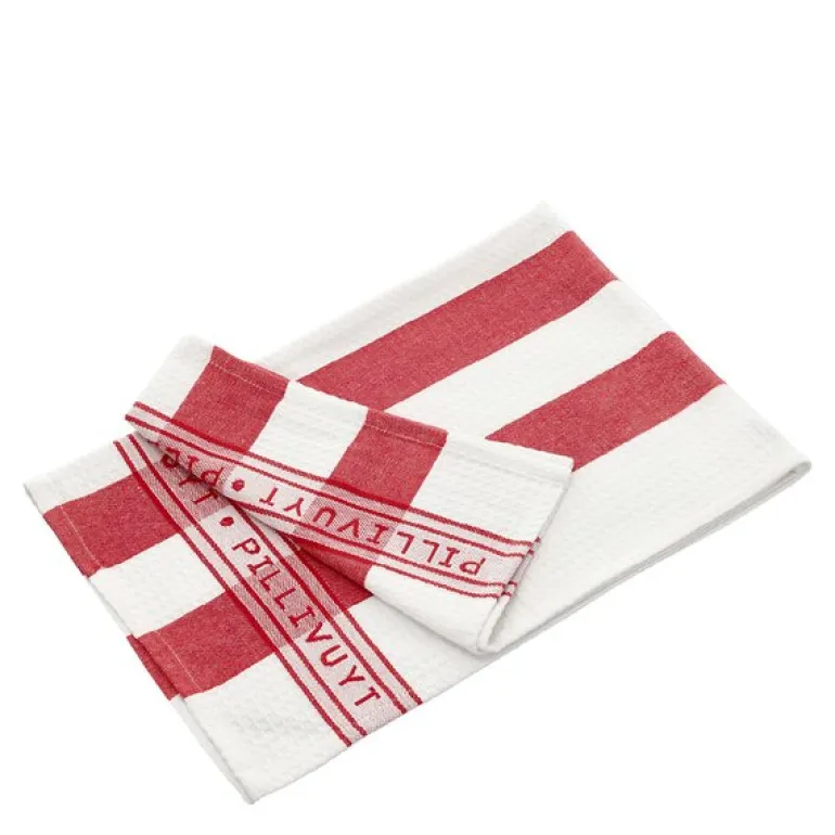 Pillivuyts kjøkkenhåndkle i størrelsen 60×90 cm er et funksjonelt valg for kjøkkenet. Dette kjøkkenhåndkleet i rødt og hvitt er produsert av resirkulerte tekstilfibre, der stoffrestene sorteres, brytes ned og veves på nytt. Dette kan medføre små variasjoner i fargetonen fra parti til parti.