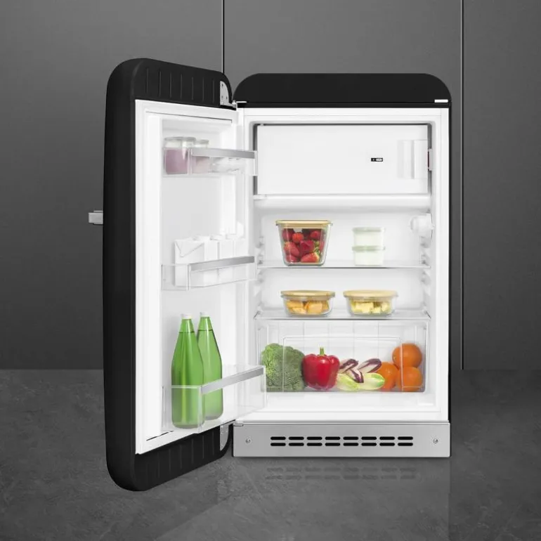 Smeg kjøleskap (FAB10) i retro 50`s design i fargen svart, venstrehengt med frysedel.