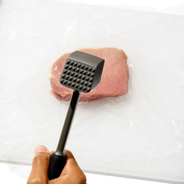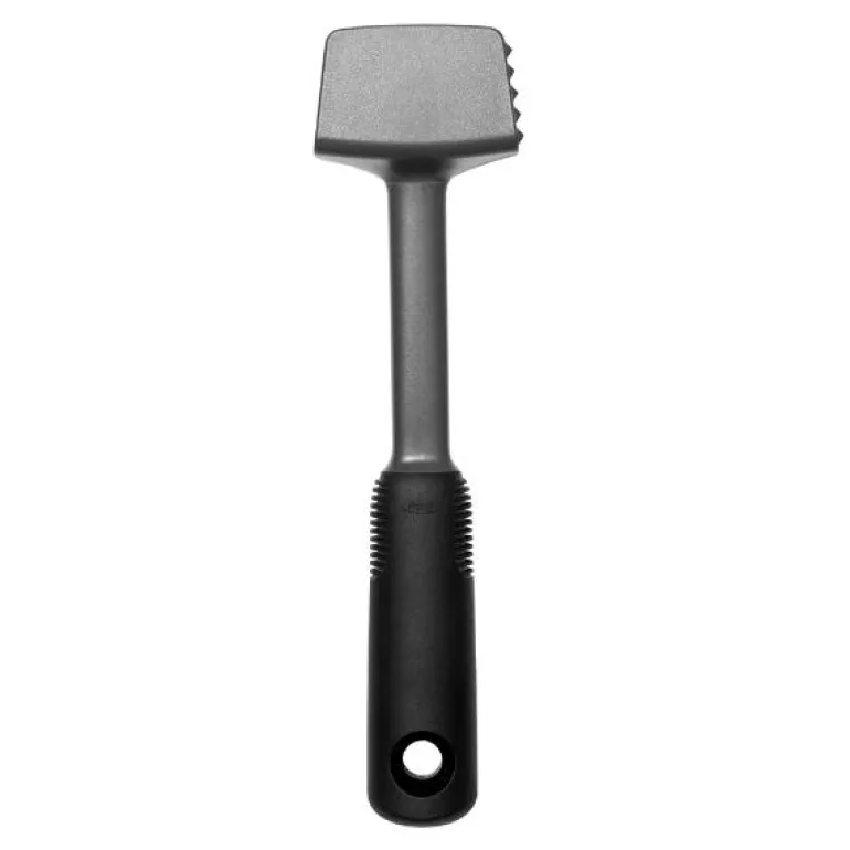 OXOs kjøttbanker er solid som et riktig verktøy. Kjøttbankerens flate side banker kjøttet og den taggete siden mørner det. Hodets vekt og vinkel er designet så du banker kjøttet med minst mulig anstrengelse og belastning av armen. Non-slip håndtaket i bløt gummi gir deg et sikkert og behagelig grep, også hvis du har våte hender, og det absorberer rystelsene når du banker kjøttet og skåner håndleddene. Kjøttbankeren har en belegning av ABS og tåler oppvaskmaskin.