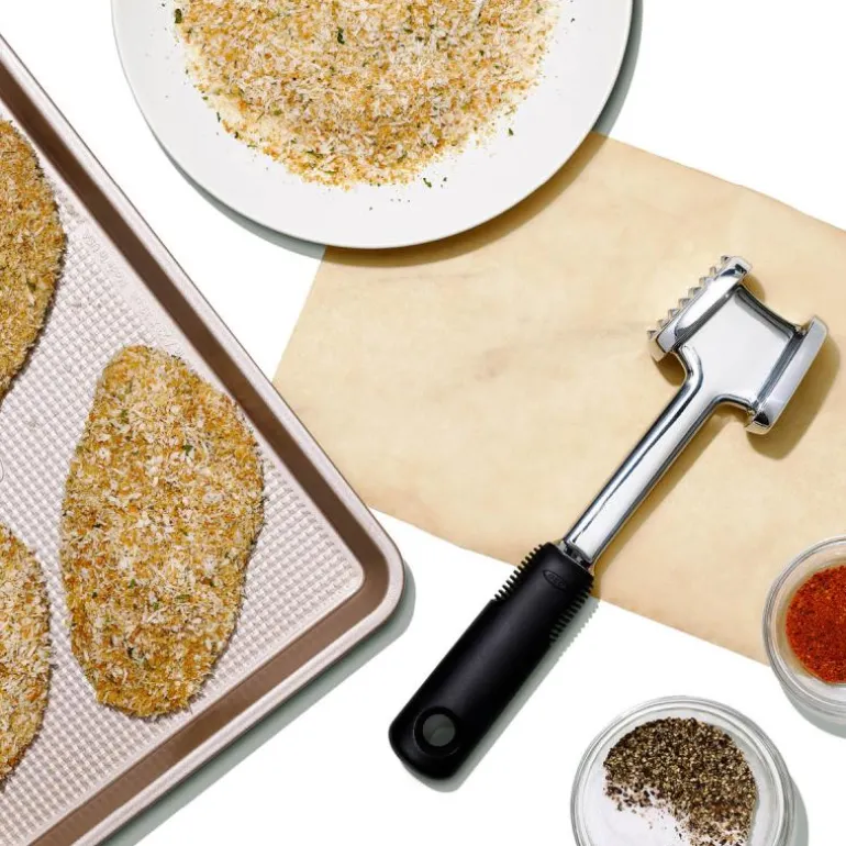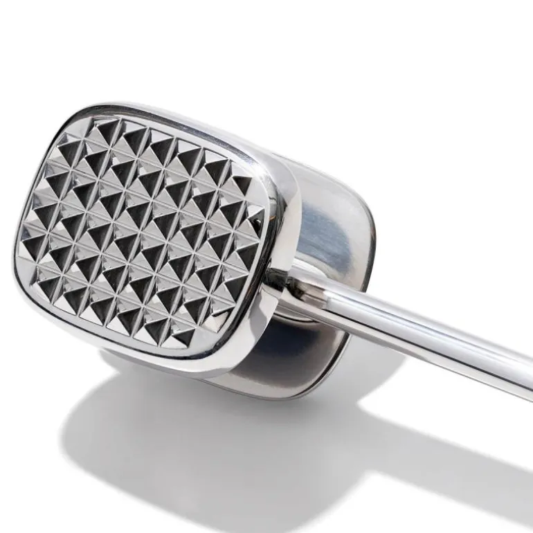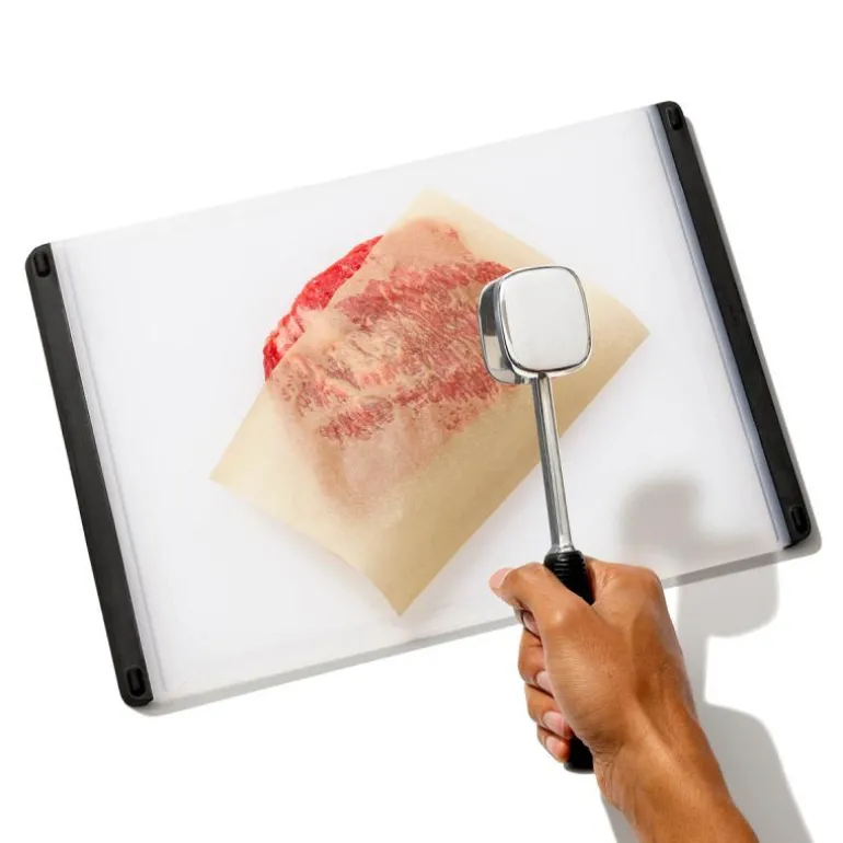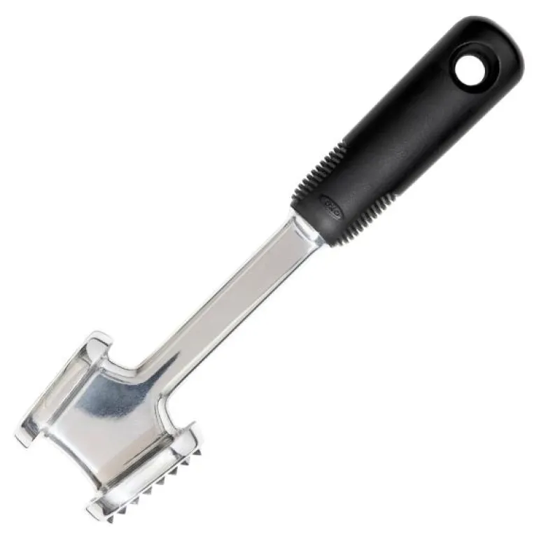 OXOs kjøttbanker er solid som et riktig verktøy. Kjøttbankerens flate side banker kjøttet og den taggete siden mørner det. Hodets vekt og vinkel er designet så du banker kjøttet med minst mulig anstrengelse og belastning av armen. Non-slip håndtaket i bløt gummi gir deg et sikkert og behagelig grep, også hvis du har våte hender, og det absorberer rystelsene når du banker kjøttet og skåner håndleddene. Kjøttbankeren ikke tåler oppvaskmaskin.