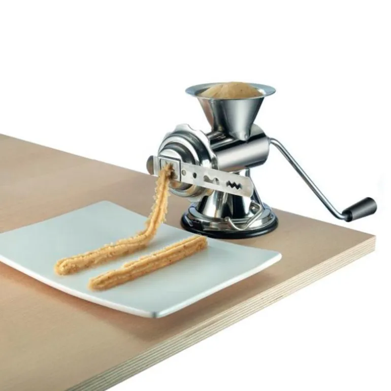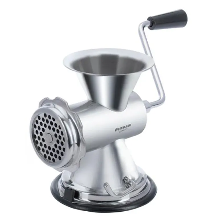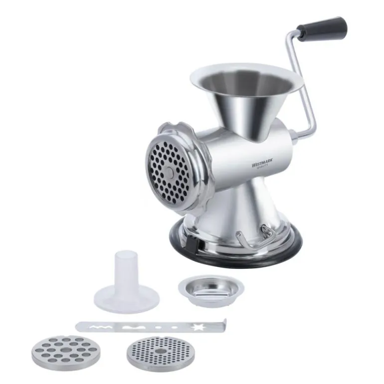 Manuell kjøttkvern i rustfritt stål. Leveres med 3 hullskiver for sliping og 1 stk bakeskive for garnering av bakverk.Hullene har Ø 4 + 5 + 8 mm. 5 års garanti. Bør håndvaskes.Sugefoten sørger for at kvernen er stabil og sikker