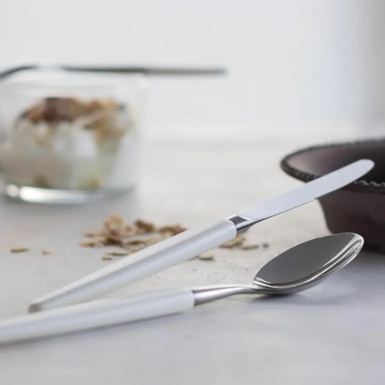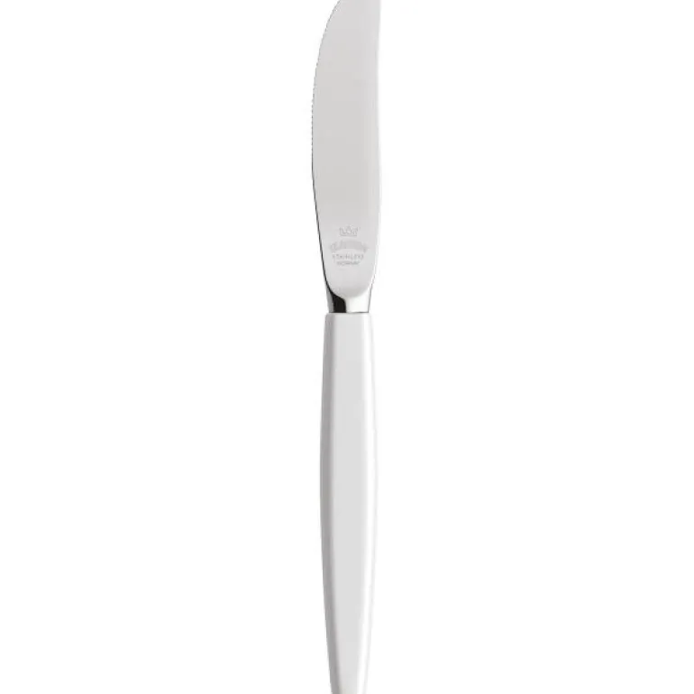 Kniv 21 cm hvit. Skaugum bestikk med hvitt skaft er en klassiker! Skaugum Bestikks kronelogo er deres garanti for at du holder et håndlaget, norsk kvalitetsbestikk. Bordknivene er smidde, som gir en skarphet og kvalitet som ingen andre produksjonsmetoder klarer. I tillegg til kniv, skje og gaffel har vi et bredt utvalg av andre deler, som for eksempel kakespade, salatbestikk og ostehøvel. Bestikket er produsert i rustfritt stål med 18/8-kvalitet. Skaugum Bestikk kan vaskes i maskin. Vi anbefaler at du alltid skyller bestikket før du setter det i maskinen, bruk gjerne finvaskprogram. Skaugum sine bestikk har sett like ut helt siden starten i 1943. Skaugum lager sine bestikk for hånd, som er en spennende og tidkrevende prosess. Stålet varmes opp til 1035 grader før vi slår med en hydraulisk hammer ned i ønsket form. Våre plastskaft blir støpt mens treskaftene sages og freses. Vi skjefter, polerer, og borer hver del for hånd på maskiner fra en annen tidsalder.